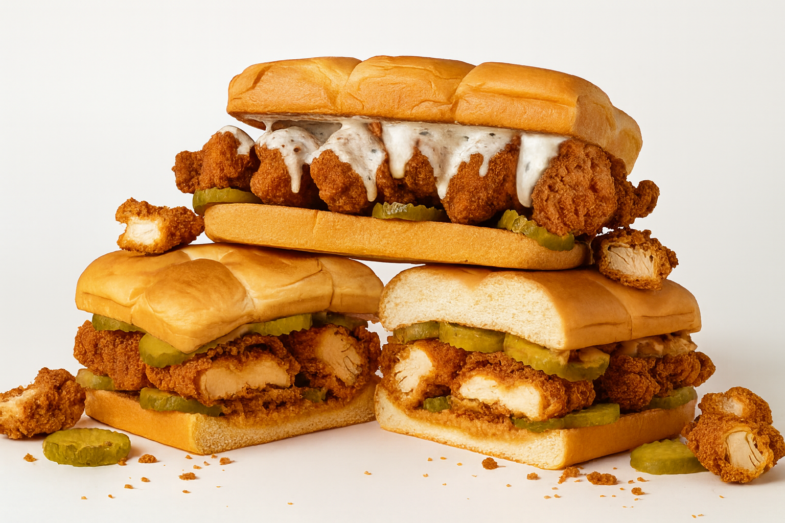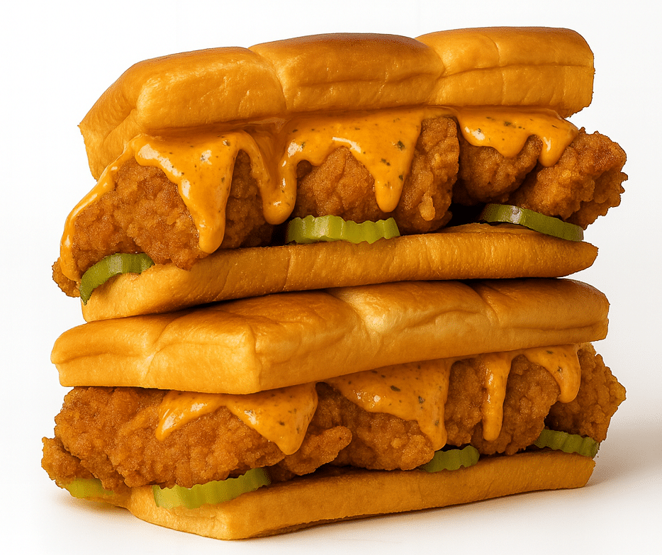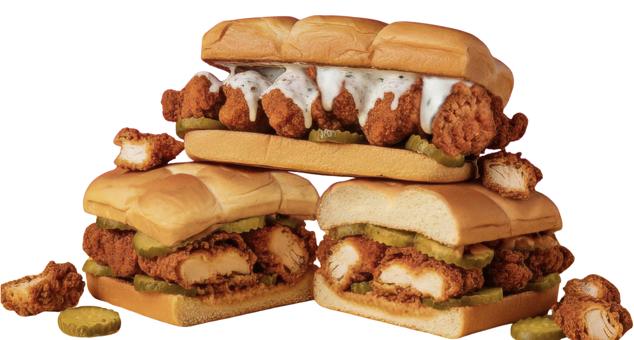 View Item: 6×6 Chick’n View Item: 6×6 Chick’nCrispy chick’n strips, pickles, and secret sauce slayed between 6 toasted King’s Hawaiian® sweet rolls. Leave no crumbs…