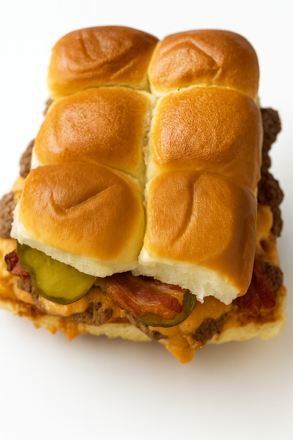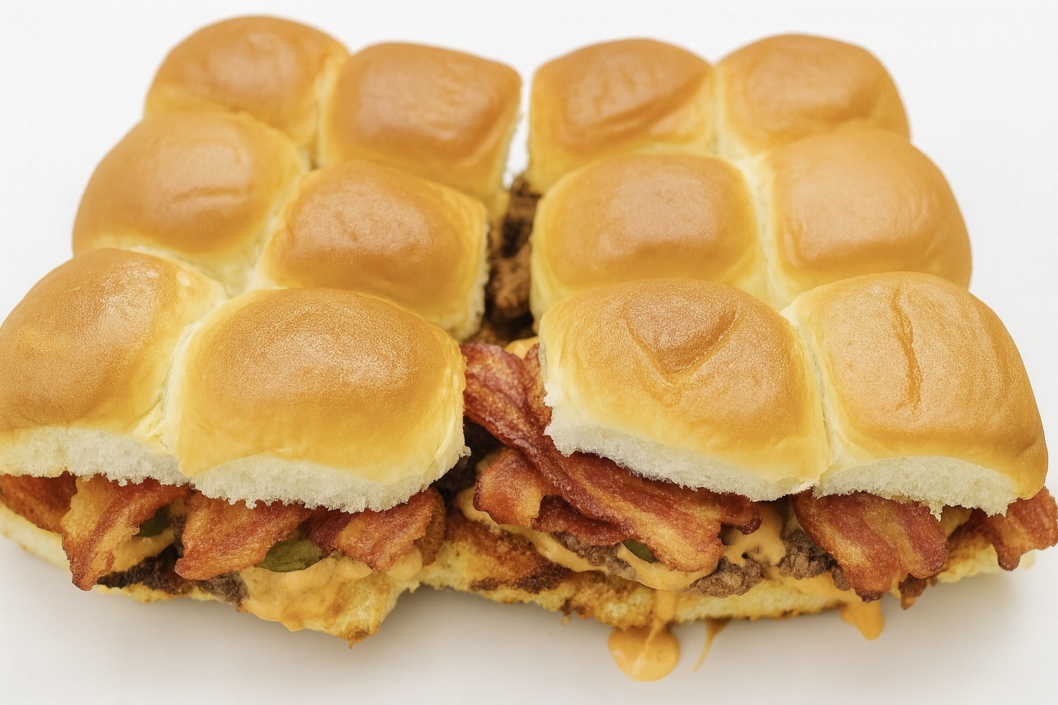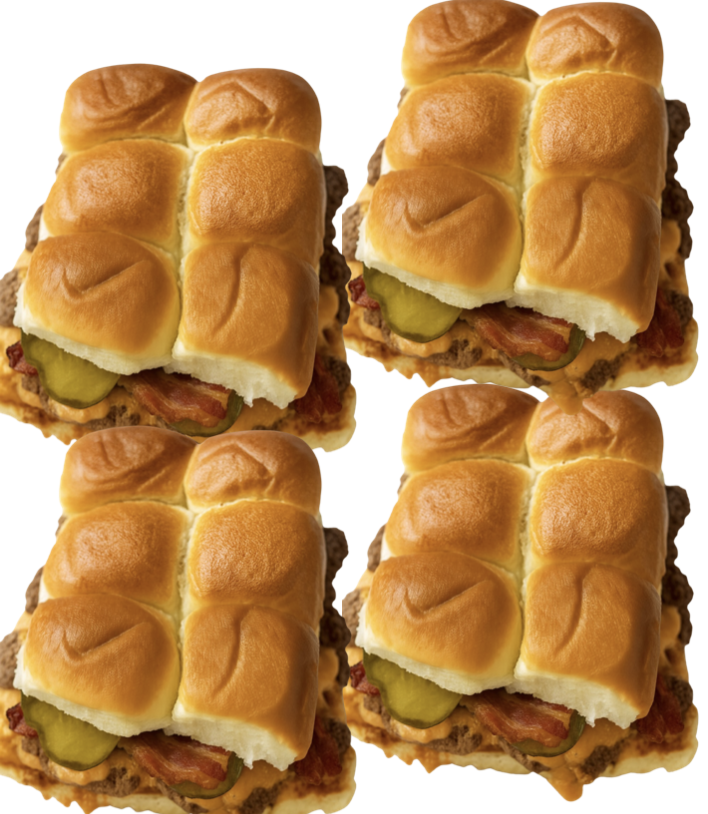 View Item: 24×24 Bacon Smash View Item: 24×24 Bacon Smash24×24 melt in your mouth smash burger sliders, topped with American cheese, smoked bacon, pickles, and secret sauce slayed between 24 toasted King’s Hawaiian® sweet rolls. Leave no crumbs…