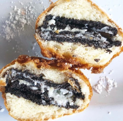 4 DOUBLE STUF OREO® cookies battered in krusteaz sweet cream mix, topped with powdered sugar, and a side of chocolate 💋